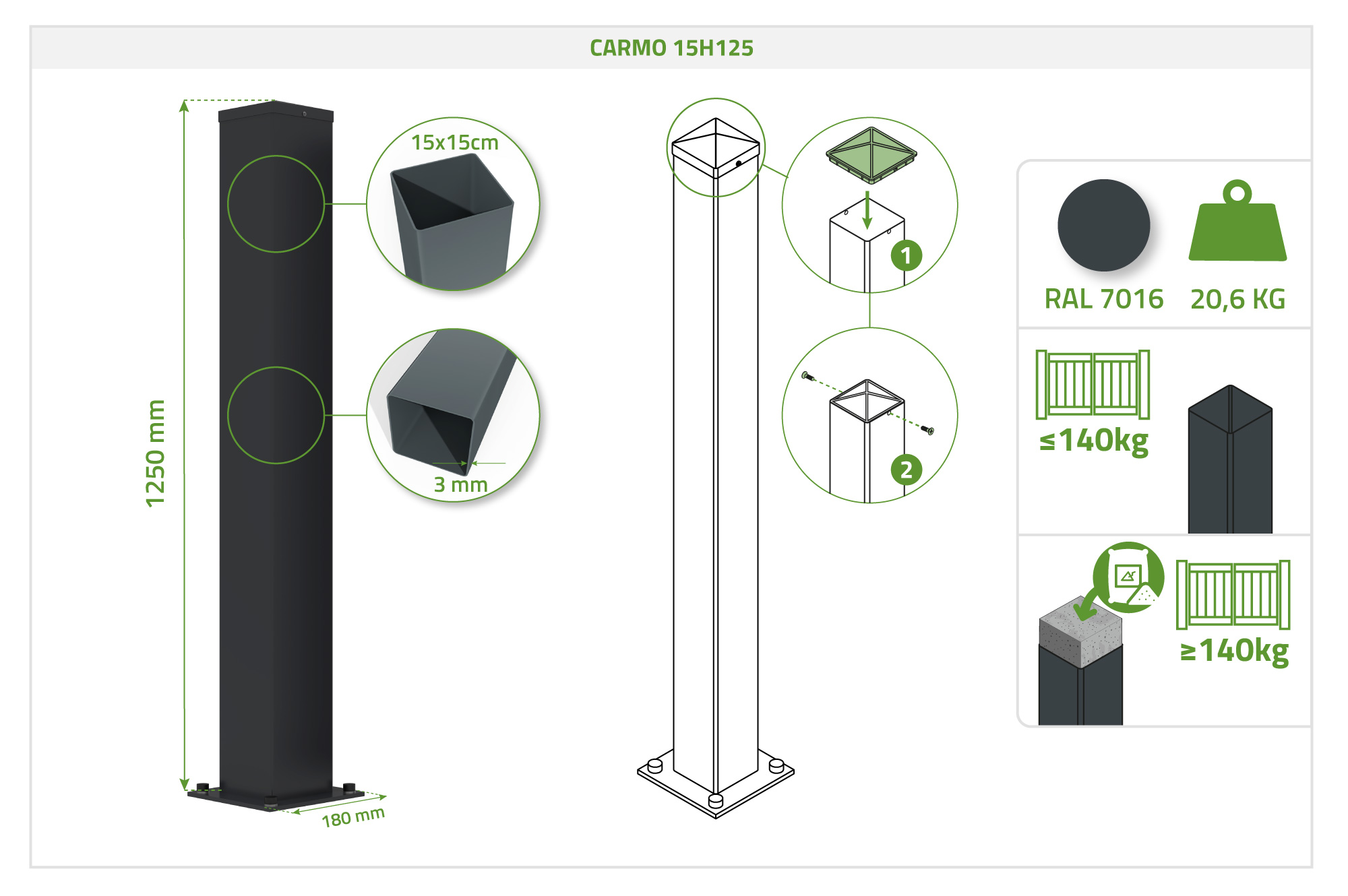 Αυτές οι χαλύβδινες κολώνες CARMO 125 cm έχουν σχεδιαστεί για την εγκατάσταση πυλών NALI και πεζών ύψους 120 cm, παρέχοντας αξιόπιστη και μακροχρόνια στήριξη για τις εξωτερικές σας εγκαταστάσεις.